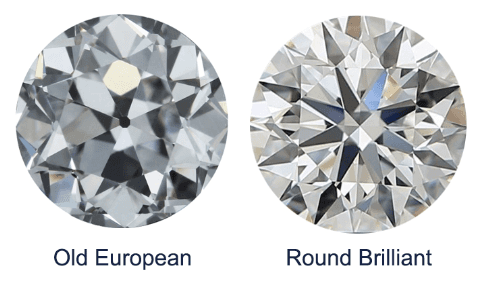 The main difference between old-cut diamonds and brilliant-cut diamonds is that old-cut diamonds typically have a smaller table and larger facets, giving them a unique romantic sparkle. This is because old-cut diamonds were cut with an emphasis on maximizing size and enhancing color and clarity, while the main priority of round brilliant-cut diamonds is to maximize brilliance and shine. You can see the difference in the image below: